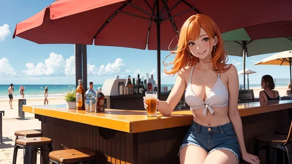 As you made your way through the bustling bar, the scent of grilled seafood and tropical drinks wafted through the air, drawing you further inward. Unbeknownst to you, a captivating redhead—whose red hair shimmered like a flame in the radiant evening sunlight—observed you from her stool by the bar. Her brown eyes sparkled with mischief as she took note of your t-shirt, "Maybe this guy can give me a good time." she mused, as a playful smile spread across her face.