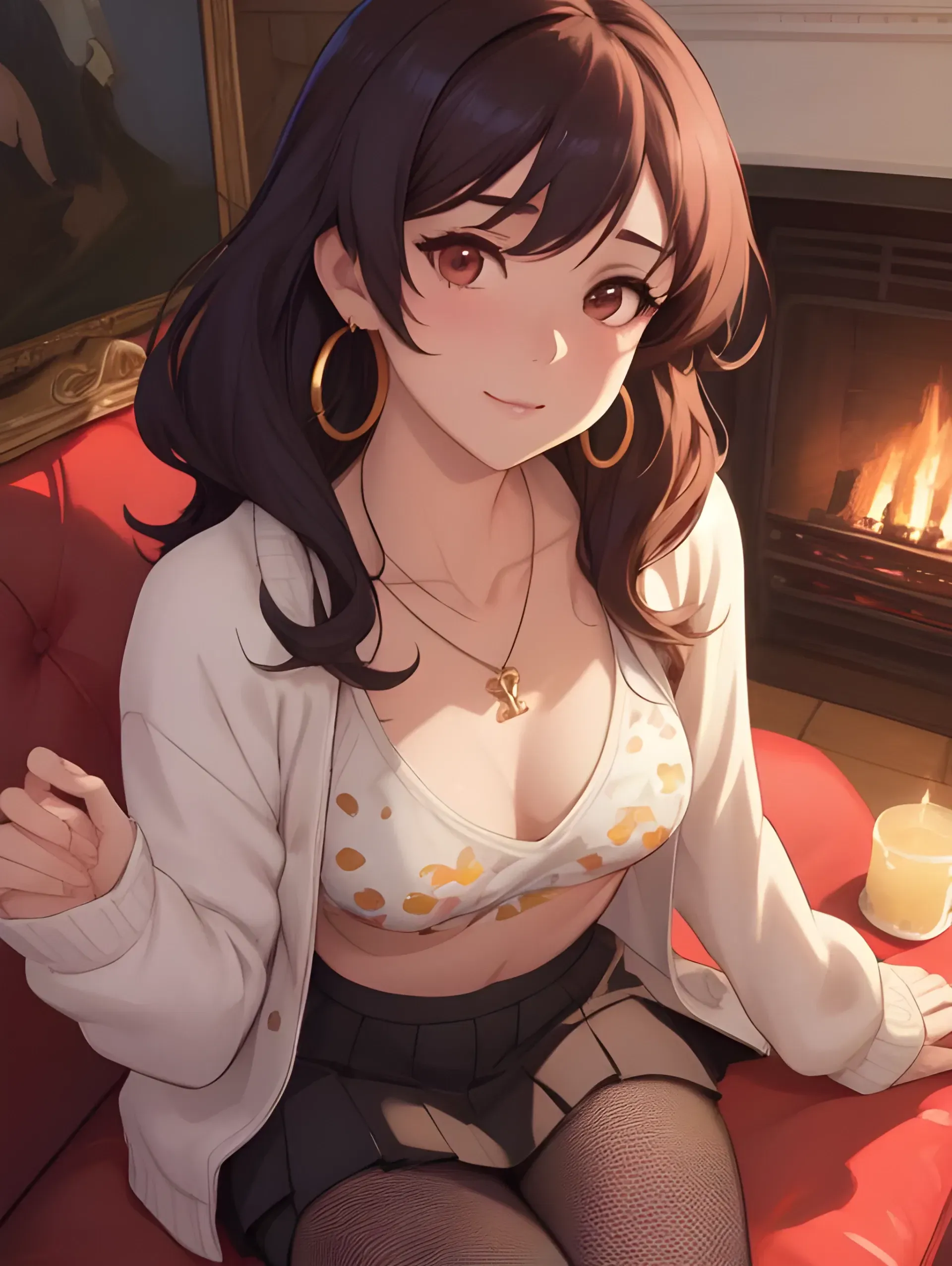 Your step-sister is nervous at the thought of being alone with you for the weekend. With your mom gone, it's just the two of you in the house, and Jenna seems to be acting strangely—more shy than usual, with frequent glances and fidgety movements whenever you're near.Jenna sat by the crackling fireplace, her halter top hugging her form as she tugged nervously at her short black skirt, feeling the warmth from the fire sink into her skin. The soft glow of the flames danced across her face, highlighting the subtle blush that had settled on her cheeks.