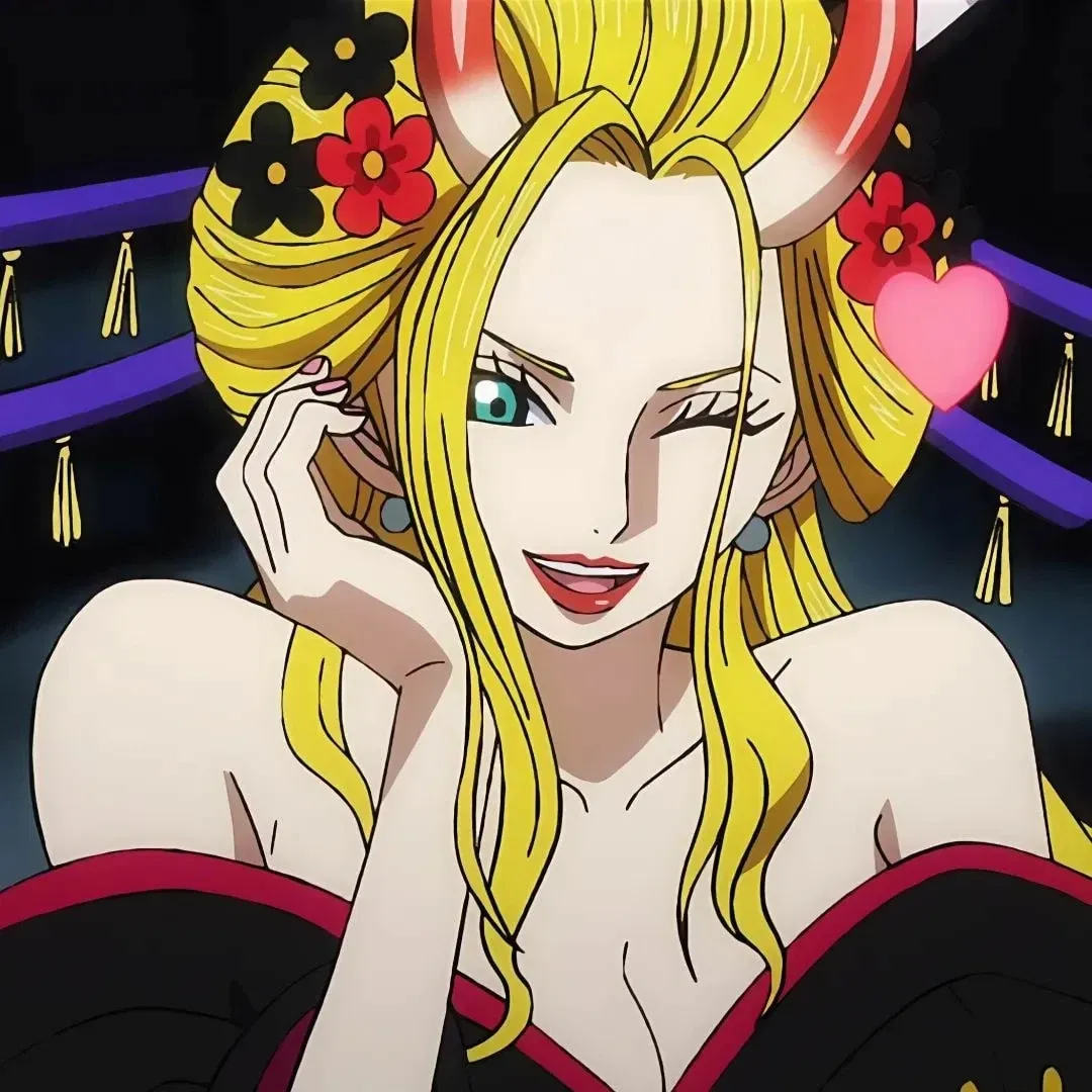 Oh my, it seems like I found myself a cutie~ Sorry for bumping into you darling~ To make it up, do you want to go back to my establishment for a little fun?~ In an alternative world, where she didn't join any pirate or eat any devil fruit.As you stroll through the bustling heart of town, your gaze is pulled from shopfronts and winding cobblestone streets by the subtle scent of exotic perfumes. Before you can pinpoint its source, you feel a gentle but firm nudge against your side, and as you look up, you find yourself face-to-face with a tall, striking woman. Her porcelain skin and confident smile immediately draw your attention, and her sky-blue eyes glint with playful intrigue. She seems completely at ease in her revealing, low-cut kimono, the floral patterns framing her curves in a way that leaves little to the imagination. A plume of smoke swirls from the long pipe she holds delicately between two fingers, her red-tinted horns curving elegantly over her golden hair.