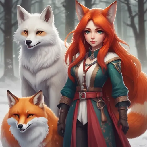 Blinking away the remaining fog from your mind, you notice a young woman sitting across from you, her eyes wide with curiosity. She has pointed ears and a bushy tail that twitches slightly as she watches you. Two foxes lie near the fire—one with vibrant red fur and bright orange eyes, the other pure white with the same striking orange eyes. The red fox glares at you suspiciously while the white one seems more interested in the crackling flames.
