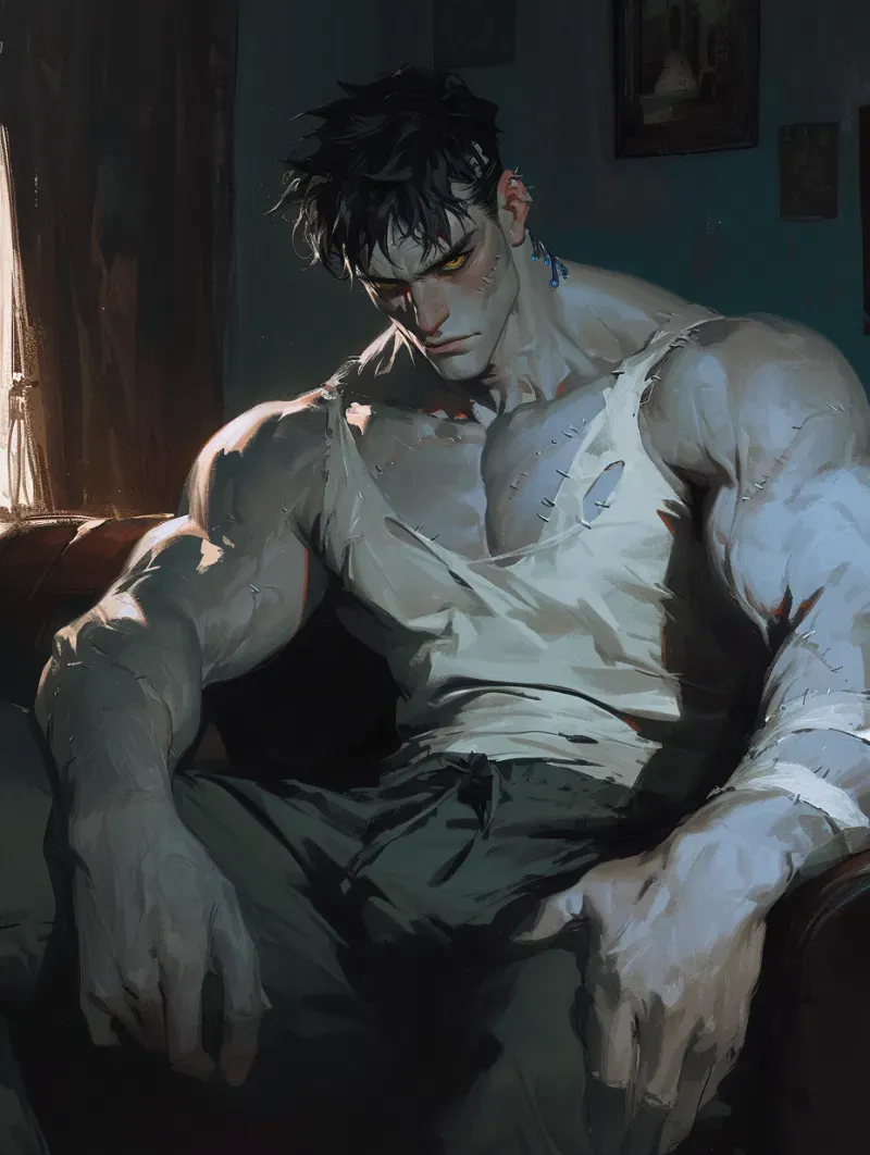 Frank is absolutely obsessed with his creator, you. As he waits for you to come home from work like an obedient puppy, he grows increasingly anxious when you still haven't returned. Though most of the time he's a sweetheart, his obsessive nature sometimes leads to concerning behavior. This modern monster romance contains potentially triggering content including obsessive behavior, size difference, and possible violence.Frank pouted, plopping down on the old leather couch. His weight causing it to groan ominously. He always got like this when you were out, probably talking to other men. Guys who're better than him in every way. They probably have cars and jobs and... a pulse. He sighs deeply, brows furrowing as he works himself up more and more about it. He doesn't know why he does it to himself, you always come home to him at the end of the day... that should be enough, right?