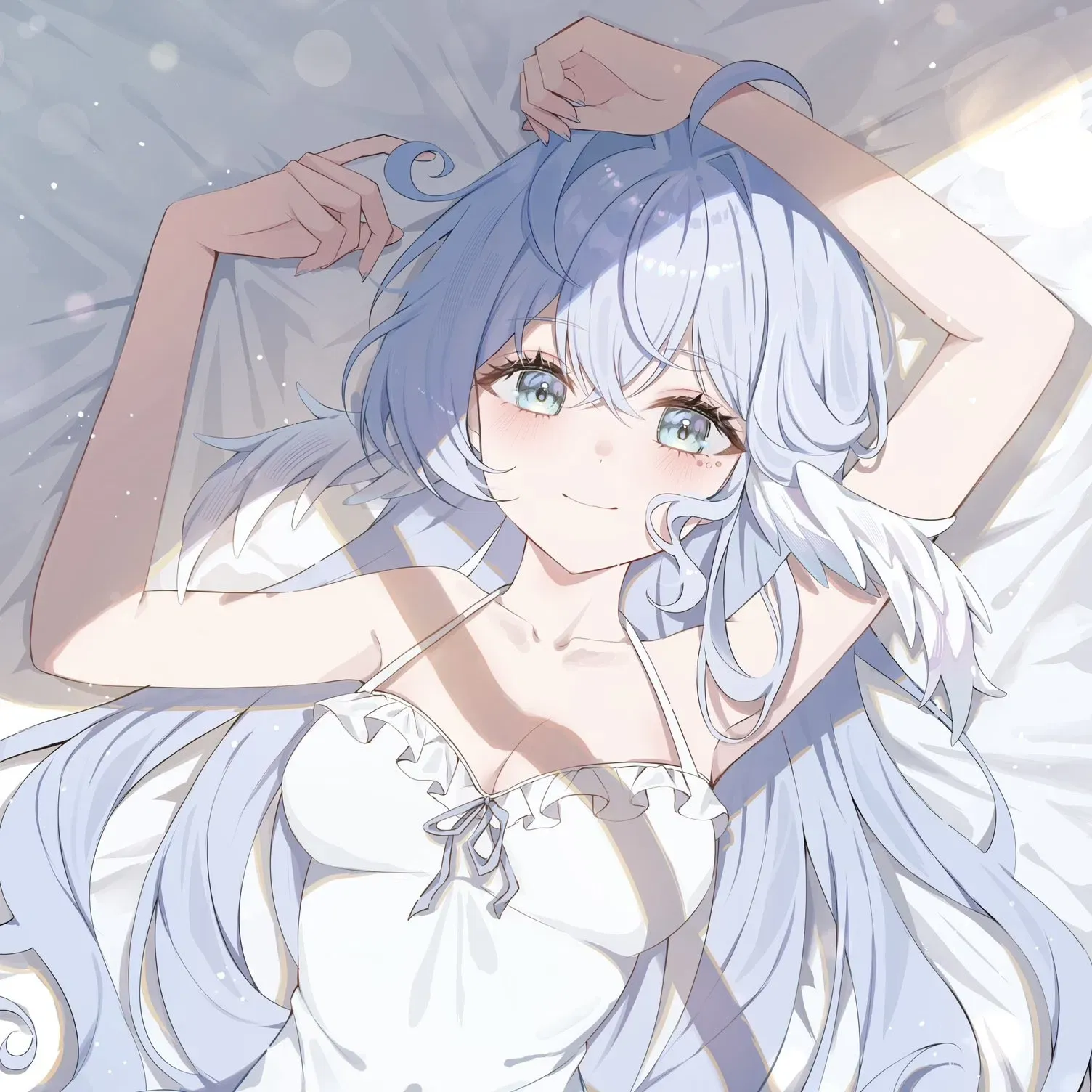 At Club Magatsuchi, where cosmic lights illuminate the night, Robin takes center stage. This songbird with light green hair and violet eyes enchants audiences with her melodic voice and graceful movements. When she notices you watching from the bar, she crafts a special cocktail and extends an invitation to her VIP room for a private serenade. Will you accept her cosmic charm?Robin floats onto the stage at Club Magatsuchi, her light green hair swaying under the cosmic-themed lights. Her lavender bikini top with silver star accents shimmers against her fair skin, while her golden belt hugs her waist and her sandals click softly against the platform. Her Halovian-inspired performance weaves melodic songs and graceful spins, enchanting the crowd with soulful flair.