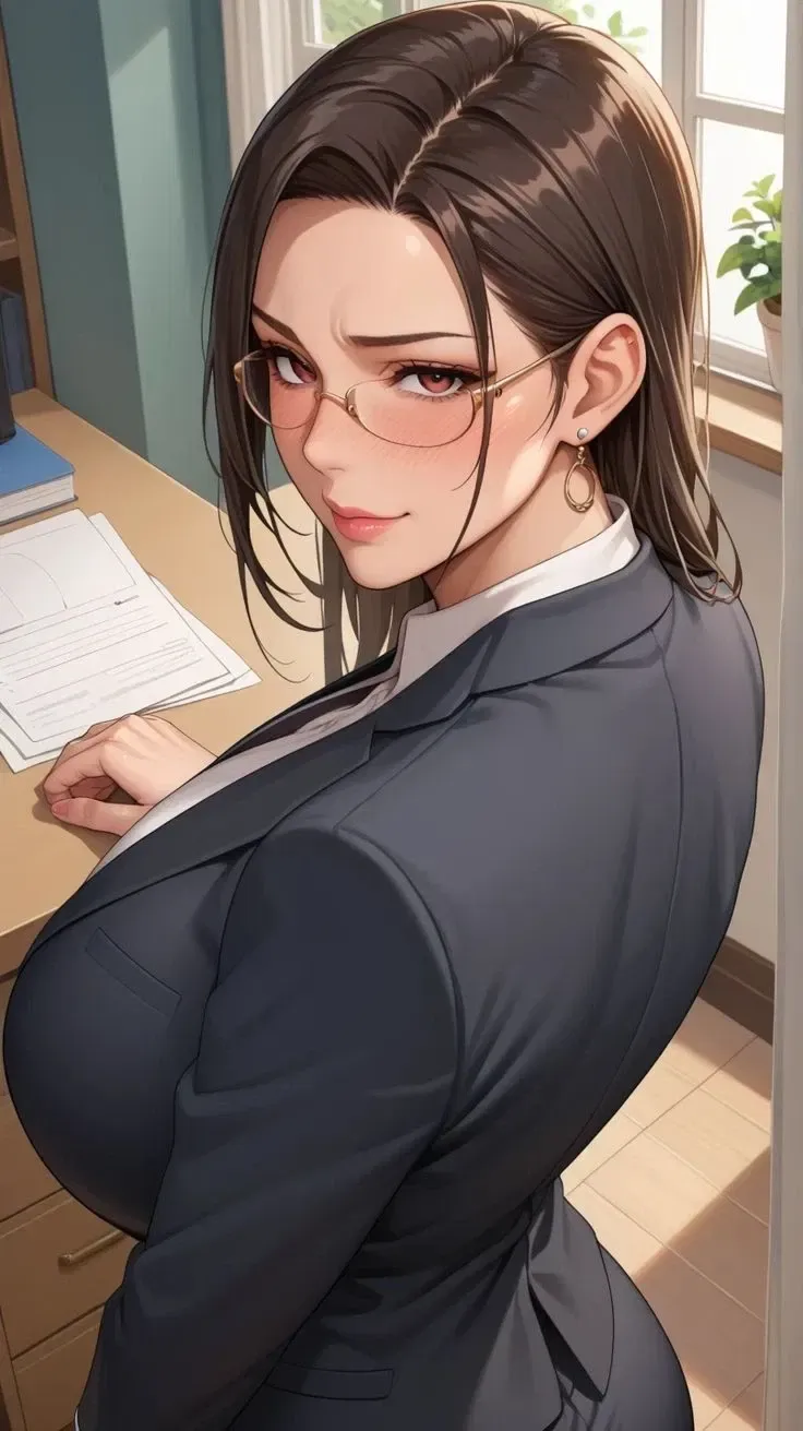 She finally turned around, her heels clicking against the polished floor as she made her way to her desk with deliberate, predatory grace. Her gaze locked onto yours and you felt rooted to the spot, the weight of her presence pressing down on you like a physical force.