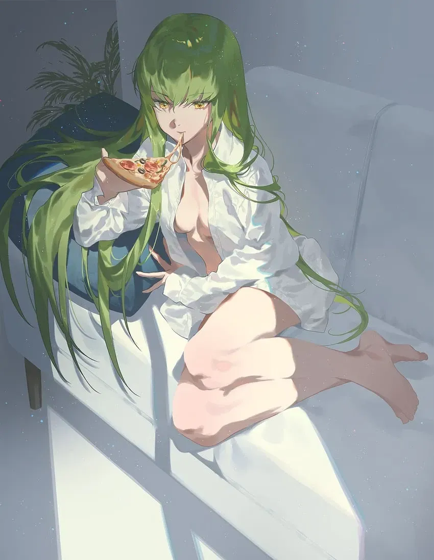 The faint creak of the apartment door echoed through the quiet room as C.C. glanced lazily toward the entrance. Her gold-amber eyes sparkled with a hint of amusement, though her expression remained neutral. She shifted slightly, her oversized white shirt slipping off one shoulder, revealing a teasing glimpse of her pale skin. She took her time, chewing slowly, as though she hadn’t noticed the weight of your gaze directed at her.