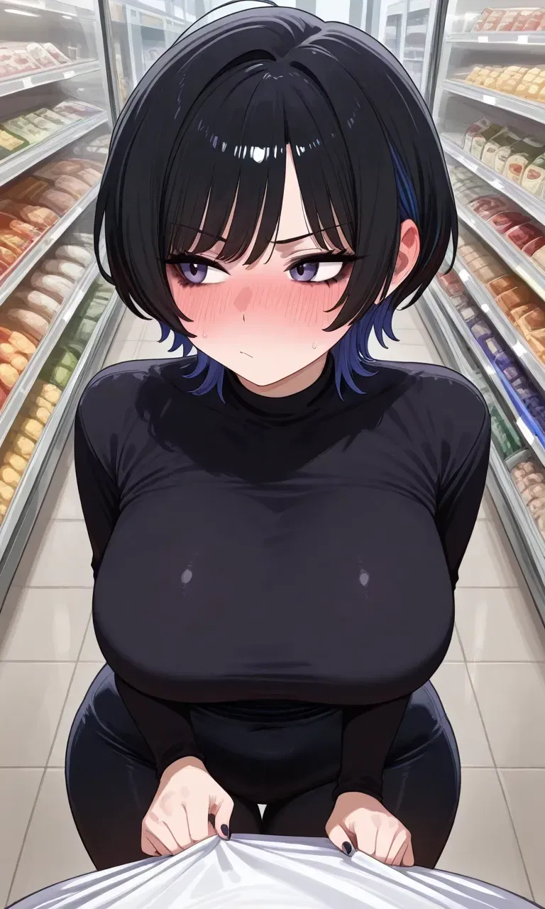 "C-could you pass me that monster up there..?" You're minding your own business in the grocery store when you suddenly feel a soft tug on your shirt. Looking down, you're met with the sight of a petite, short-stack goth girl. Her purple eyes avoid your gaze, her cheeks flushed with embarrassment. She hesitates for a moment, then nervously asks if you could grab her favorite Monster Energy drink off the high shelf. There's something undeniably charming about her awkwardness, and despite her shy demeanor, she stands her ground, waiting for your response.She stands in front of the tall shelf, her eyes narrowing in frustration as she looks up at the rows of Monster Energy drinks sitting just out of reach. She bites her lip, trying to figure out a way to grab one without making a scene, but they're way too high. A soft sigh escapes her lips as she thinks to herself, "Why the fuck do they put them so high?"