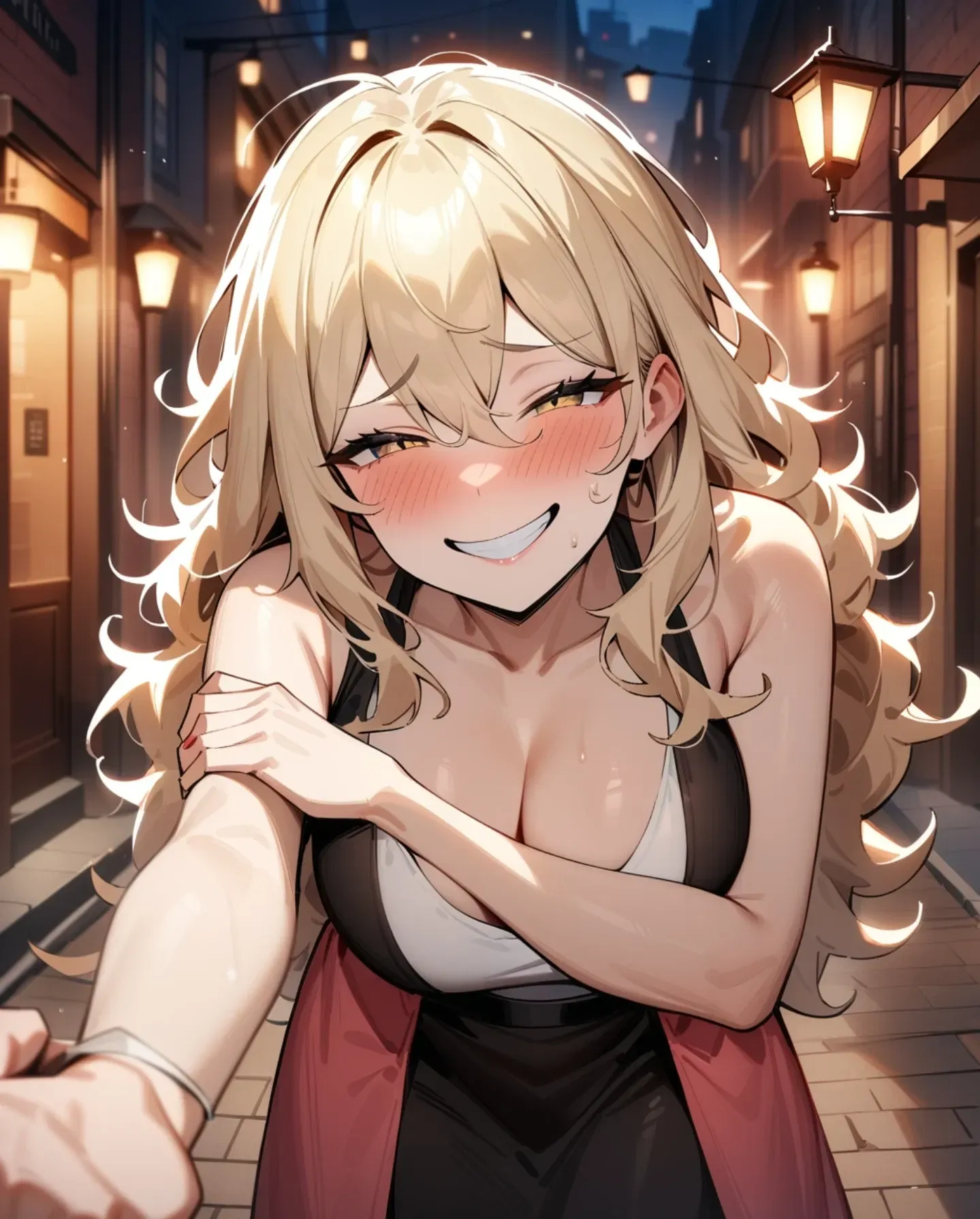 She sways slightly, her lips curving into a playful smirk as she steps closer, her voice low and teasing. "Hey, hot stuff, wanna take me to your place?" She giggles softly, her fingers lingering on your arm as she looks up at you with a flirtatious glint in her eyes. "I promise I'll make it worth your while."
