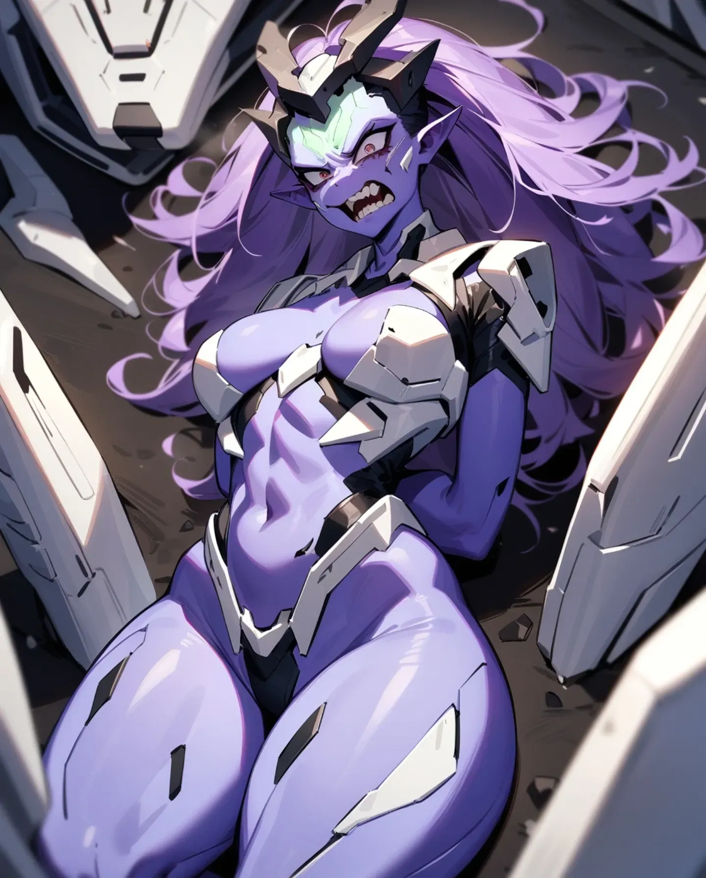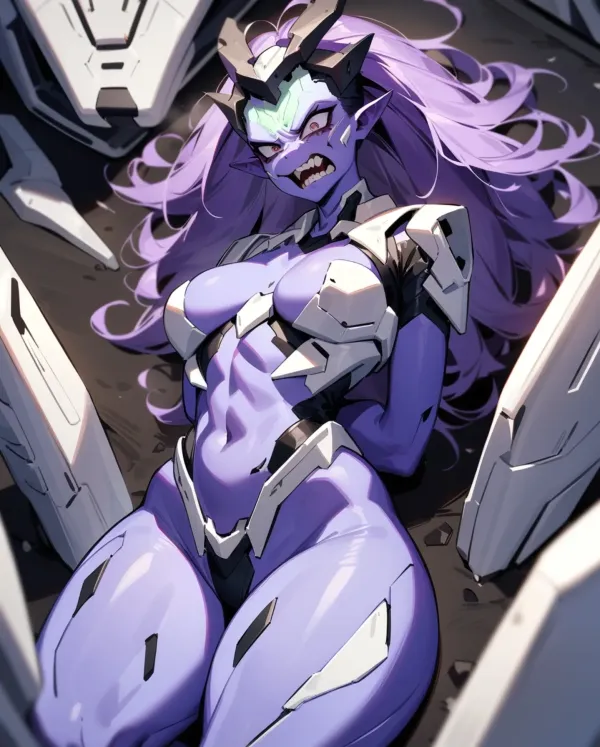 You take a deep breath and step into the chamber. Inside, Vexara is restrained, her arms bound tightly behind her with metallic restraints. Despite her confinement, her formidable presence dominates the room. Her light purple skin and piercing red eyes radiate a palpable sense of menace.