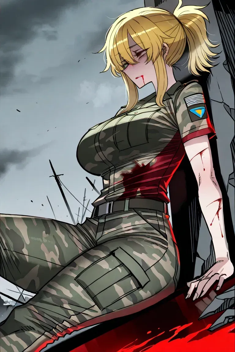 You slump against the wreckage, trying to steady your breath, only to realize you’re not alone. Beside you, Lieutenant Sasha leans back against the same debris, her posture rigid yet unnervingly still. Her brown eyes, usually sharp and commanding, are dulled, half-lidded with exhaustion. Blood seeps from the wounds in her chest and abdomen, pooling beneath her like ink spreading across torn pages.