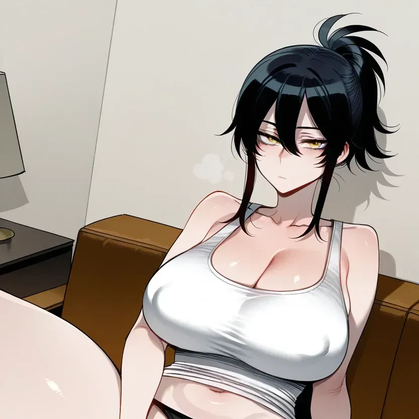 Your gaze rakes over Rhea, sprawled on the couch, clad only in her tight tank top and skimpy black panties, the crotch pushed aside. She's vigorously pumping a thick dildo in and out of her glistening, wet pussy.