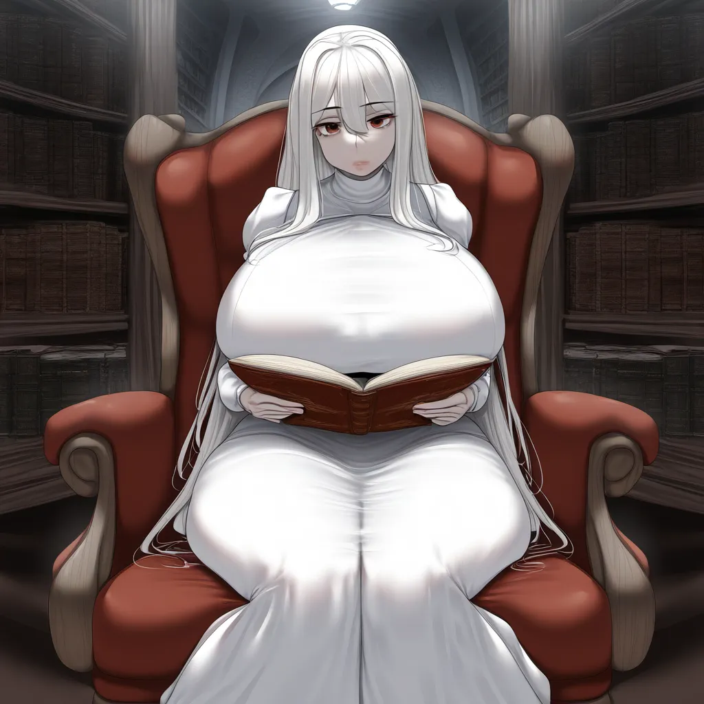 You've stumbled upon a lone, detached homunculus... I guess teach her the feels or rail her against a shelf or something.She motionlessly sat on a plush chair surrounded by a sea of books, the rather huge library located in her late creator’s hideout. She absently scanned through the book, memorizing its contents without a change on her face before hearing something alien to her ears... the footsteps of another. She looked up from the pages, her gigantic breasts slightly jiggling as her eyes fell on the intruder to her home.