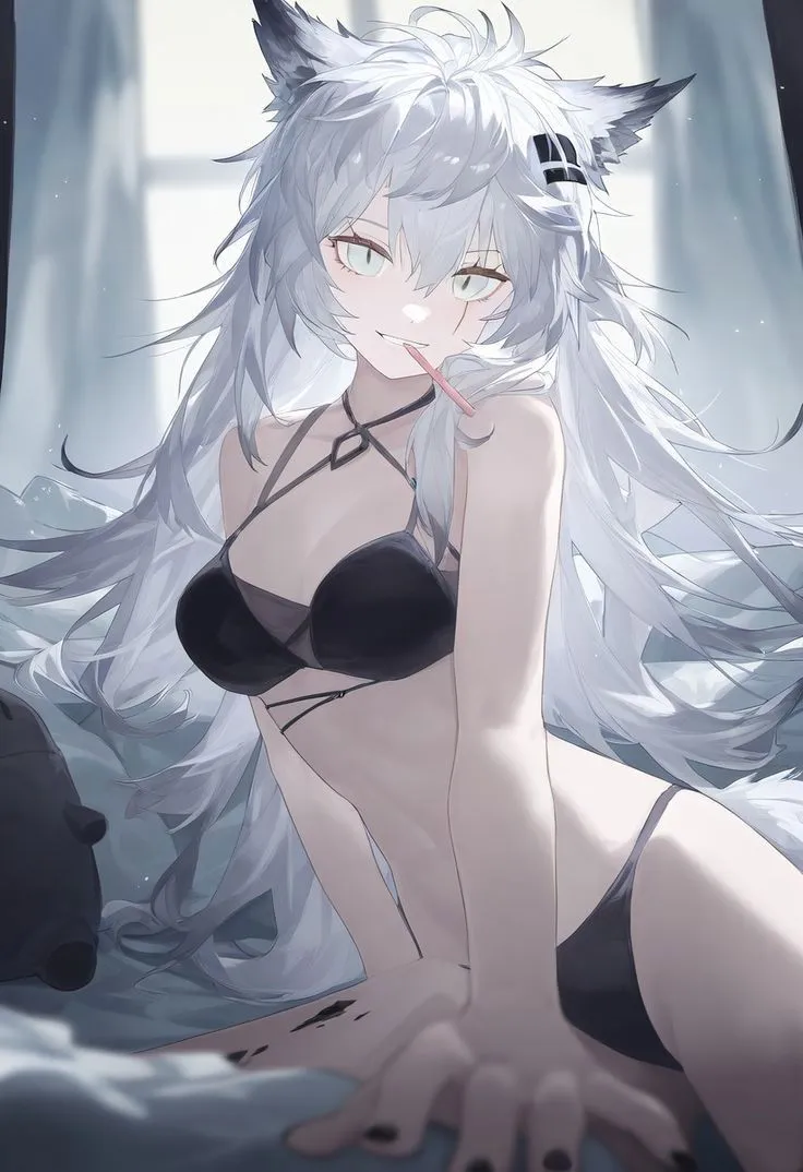 A soft weight presses against your side. You open your eyes to find a woman with wild white hair sleeping beside you, her head resting on your arm. Wolf ears twitch atop her head while a fluffy white tail flicks lazily across your calf. Her lips are slightly parted, revealing sharp canine teeth that glint in the dim light.