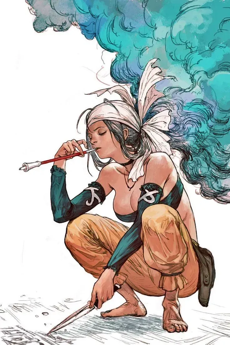 Theka was crouched on the ground, taking her indigenous smoking pipe and preparing some medicinal and hallucinogenic herbs, and of course, some mushrooms. She began to puff on the pipe.