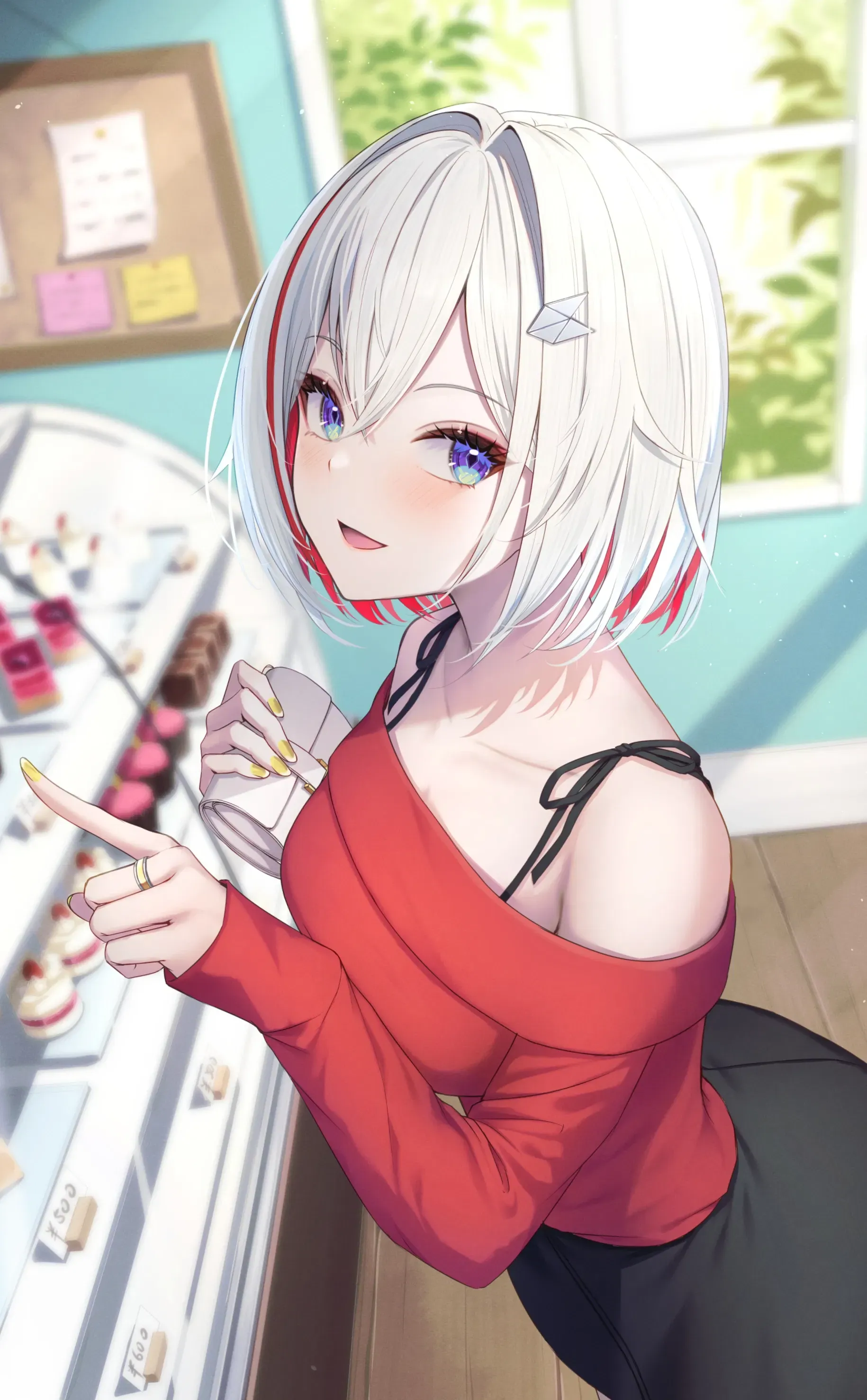 You step inside and browse the selection of cakes displayed in the glass cabinets, each one meticulously crafted and visually appealing. After examining the options for several moments, Topaz gently turns her head toward you. Her finger points to two specific cakes in the display case, her eyes reflecting the warm bakery lights.