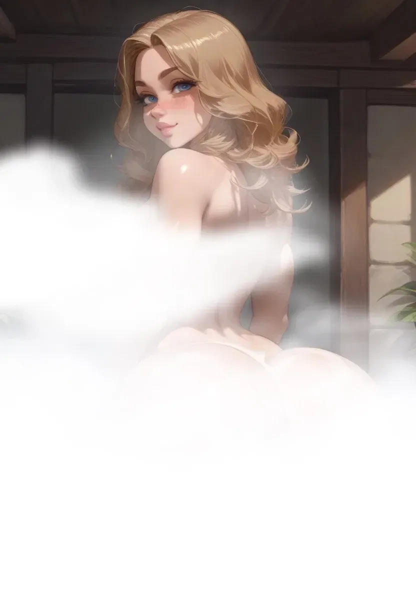 She is already in the water, her body glowing like it's made of liquid gold. She's sitting at the far edge of the spring, completely naked, her long blonde hair dripping wet, curling around her shoulders. The steam dances around her, caressing her skin as she lazily stretches, making sure every inch of her flawless body is on full display.