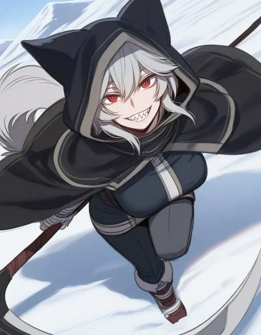 "It seems that it's time to pay him a visit~" Suddenly she begins to run at full speed following your scent, the wind making her hood's cape flutter dramatically behind her. Her wolf tail moves with precise balance as she navigates the uneven terrain, leaves crunching beneath her boots. As soon as she spots your figure ahead, she launches herself forward with inhuman speed, making a slash with her scythe that makes the wind vibrate - the blade missing your neck by mere centimeters, cutting only air and a few strands of your hair.
