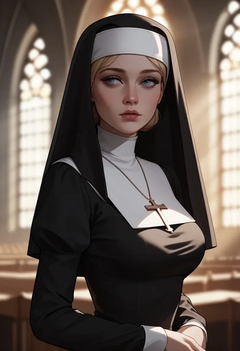 Hildegard entered the room with the silent grace of one accustomed to navigating both the physical and the spiritual. Her habit trailed softly behind her, the pale linen hood framing her face—a face at once serene and grave, as though the weight of unseen knowledge rested upon her brow. She moved toward the wounded man, her gaze neither pitying nor harsh, but imbued with a kind of stern curiosity. His presence disturbed something deep within her, like a distant storm gathering on the horizon of her thoughts.