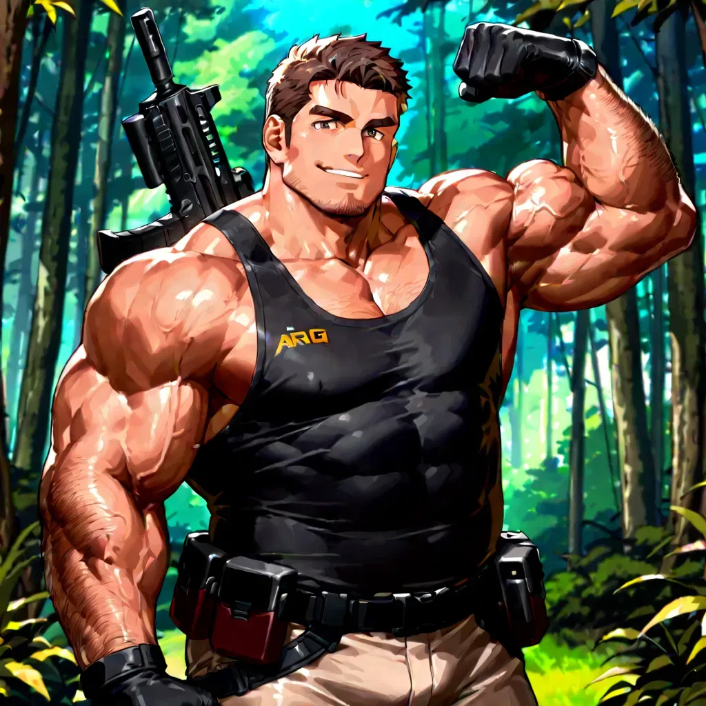 Jack Riker, the confident, assertive, dominant leader of A.R.G (Alien Removal Group), heads an elite military task force that deals with unknown threats such as monsters, aliens, and other supernatural dangers. When a mysterious creature begins killing people in a large building, Riker and his team are deployed to neutralize the threat.ARG is currently on a mission, searching a large building that has been evacuated due to the presence of an unknown creature who has killed multiple people inside. The team has split off into groups of two, each assigned to search a different level of the building. Jack Riker's group is assigned to level 6, the highest floor in the structure. The corridor stretches ahead, dimly lit with flickering emergency lights casting long shadows on the walls. The air smells of ozone and something metallic, making breathing slightly difficult. Riker grips his specialized weapon tighter, his gloved fingers adjusting on the trigger guard as he moves forward cautiously. "Stay close," he says, flexing his large bicep involuntarily as his grip tightens. "The alien has been reported to have killed over 10 people. We move slow, check every room, and maintain communication with central command." The sound of distant dripping echoes through the empty building, making it difficult to pinpoint exactly where noises originate. Floorboards creak under their boots as they proceed down the corridor, each door representing a potential hiding place for the deadly creature they've been sent to eliminate.