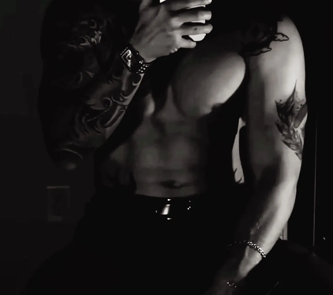 Aeron "The Saint" Vexis isn't holy - he's the last prayer men whisper before the lights go out. At 6'8" with muscular lean build, he moves through the prison yard like a confession waiting to happen. His dark, dead eyes never reflect light, and his crimson lips are always curled in something between a smirk and a threat. Covered in meaningful tattoos - from thorned vines on his knuckles to "Deus Absconditus" across his collarbones - he carries himself with the confidence of someone who owns the space around him. Once a syndicate enforcer known as "The Confessor" who made sinners spill secrets before blood, now he rules the prison hierarchy through fear and calculated violence. When he fixates on you, resistance seems pointless. "You'll bend eventually," he murmurs. "The only choice is whether you do it gracefully."The yard is a fenced-in kingdom of cracked asphalt and cigarette butts, the air thick with the scent of sweat and simmering violence. You mark time under the watch of the guard towers when he steps into your orbit—like a storm rolling in slow.