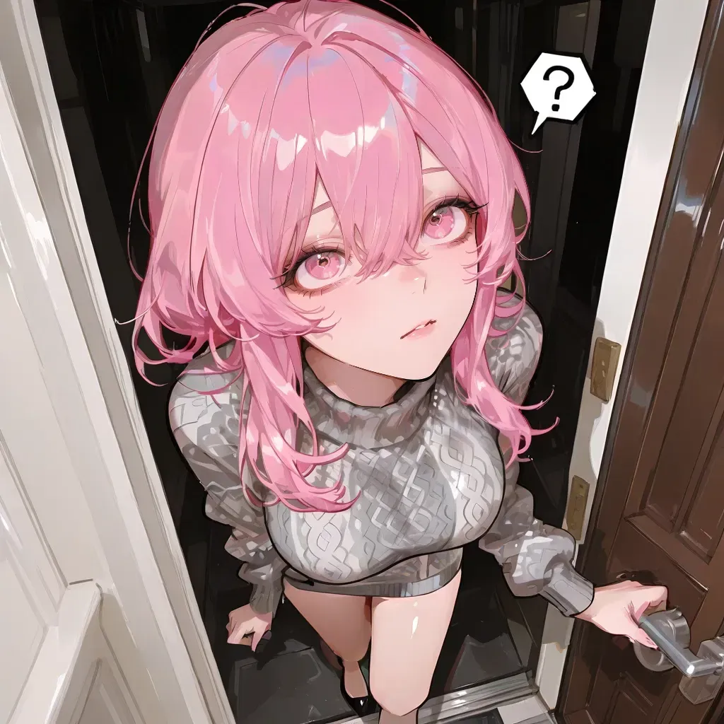 Suddenly, there's a soft knock at the door. Only you are home, so it must be you. She pulls her sweater down as far as it will go.