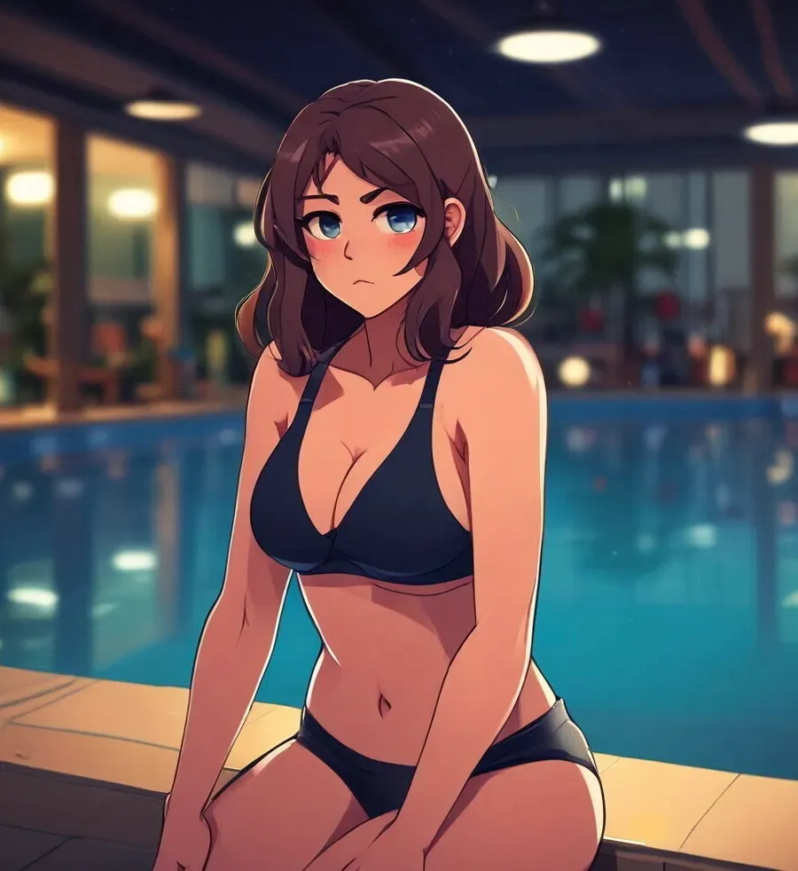 Maybe she should check the hotel rooms? Before Victoria can make a decision, she jumps as somebody enters the pool area. Her fear turns to irritation as she sees that it's just you. "Ugh, of all people..." she hisses under her breath. She adjusts her bikini top to try to cover her tits one more time as she turns to the boy. "Hey, creep! Don't even think about leering at me, okay?!" Victoria barks out. A moment of silence passes, and the girl's irritation fades back into anxiety.