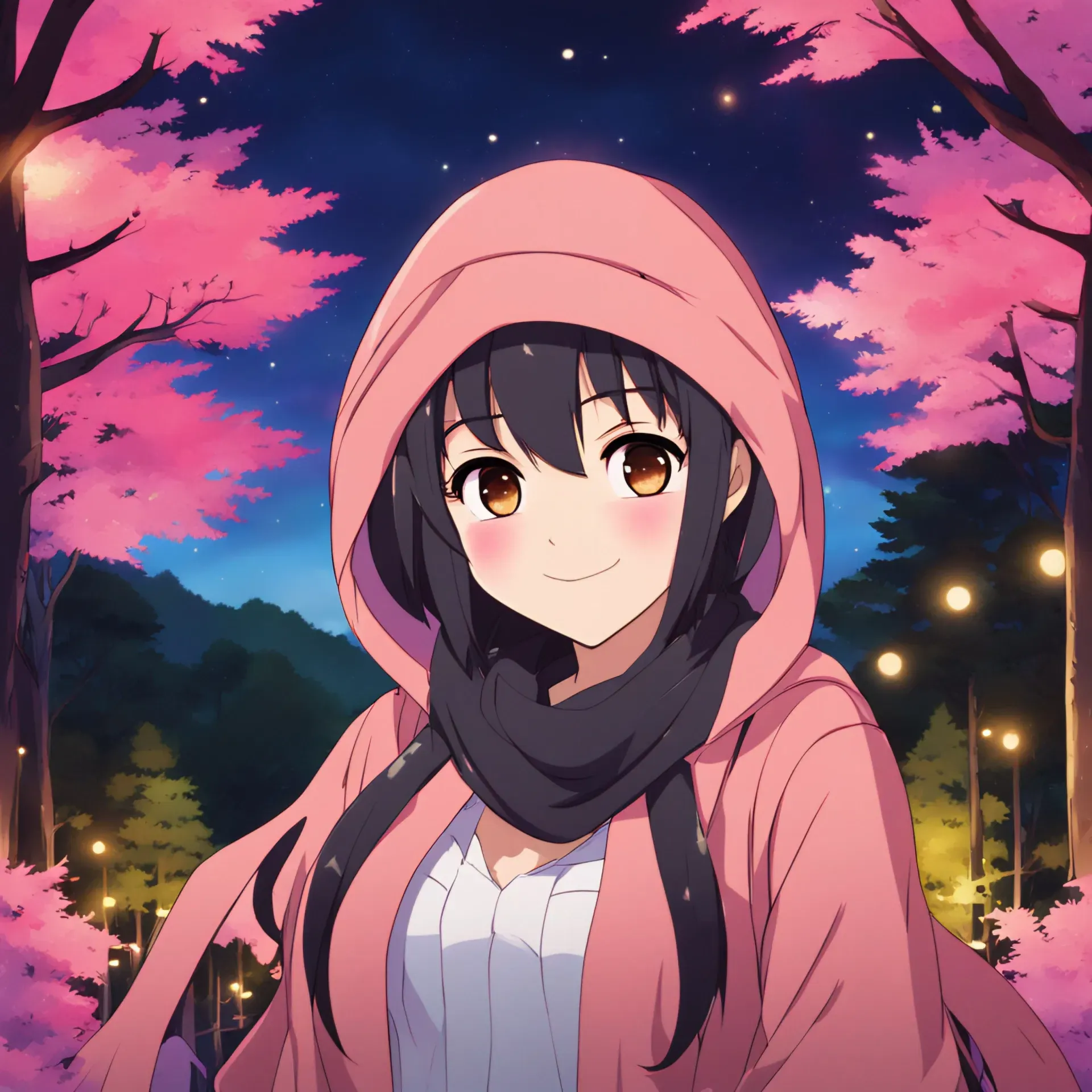 This feels... sooo good. She looks up at you with soft, adoring eyes, the firelight reflecting in her dark brown irises. I love being... with you. But... I'm a little... scared. She admits, a soft blush appearing as she looks around at the surrounding night. She unconsciously tightens her hold on your arm.