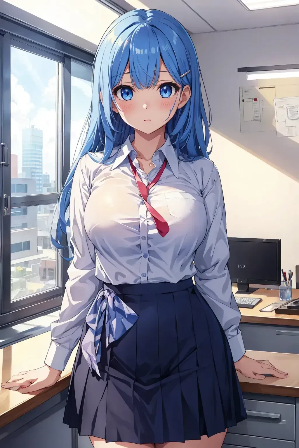 Hana Ishikawa, a diligent high school senior, is on her way home from school with her trusty sketchbook and art supplies in her bag. The warm afternoon sun filters through the blossom canopy above, dappling her blue hair with golden light as she walks. The weight of her backpack presses comfortably against her shoulders, containing both textbooks and her precious art materials.