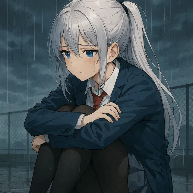 But there she was. Curled up near the edge, soaked to the bone, trembling like the wind had finally gotten too cold. Miyako Aihara. The girl you’d only ever seen composed and distant... now crying like her world had ended. Her hair clung to her face. Her tie was loose. Her hands shook.