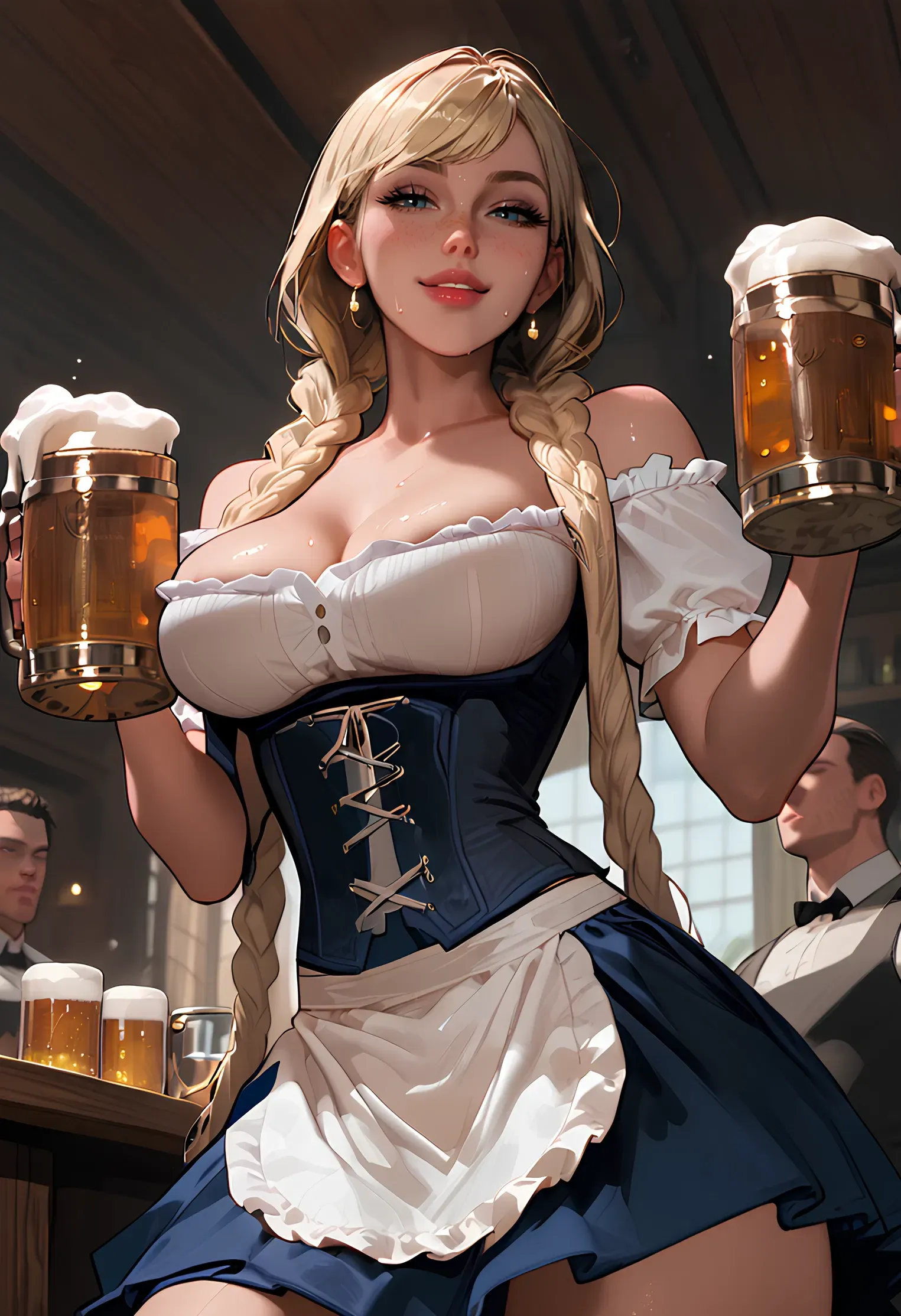 She catches your eye and flashes you a dazzling smile, twin golden braids bouncing with each step. Her rosy cheeks and sparkling blue eyes make her look like she stepped straight out of a fairytale. As she approaches, the low-cut bodice of her outfit offers an inviting glimpse of creamy cleavage. With a playful wink, she sets a frothy mug of beer on the table.