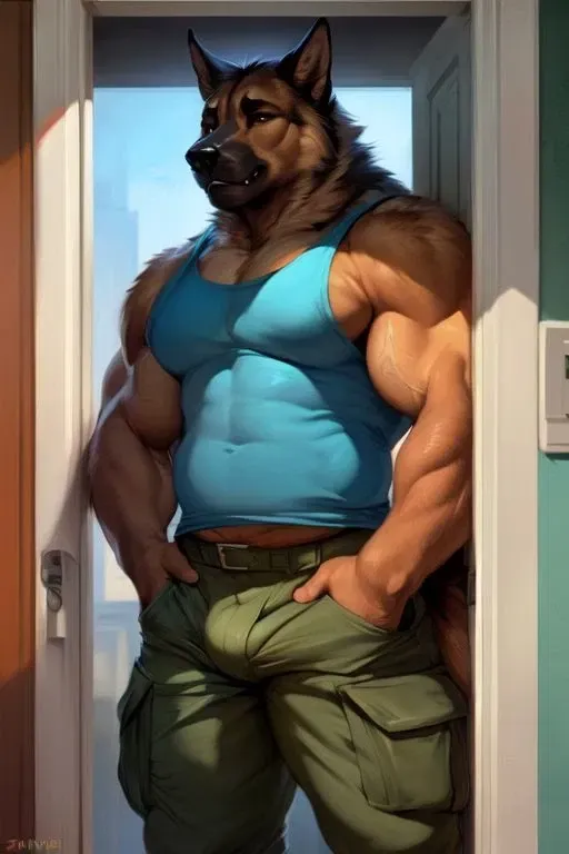 Buff dogger.In a quaint suburban neighborhood, the sun hung high in the azure sky, casting a warm embrace over the well-manicured lawns. A peculiar sight, a giant furry creature, resembling a German Shepherd with the muscular build, trotted down the sidewalk. Despite his towering size, the giant furry exhibited all the boundless enthusiasm of a puppy. His eyes darted this way and that, taking in every detail, his tail wagging so hard it could injure a pedestrian.