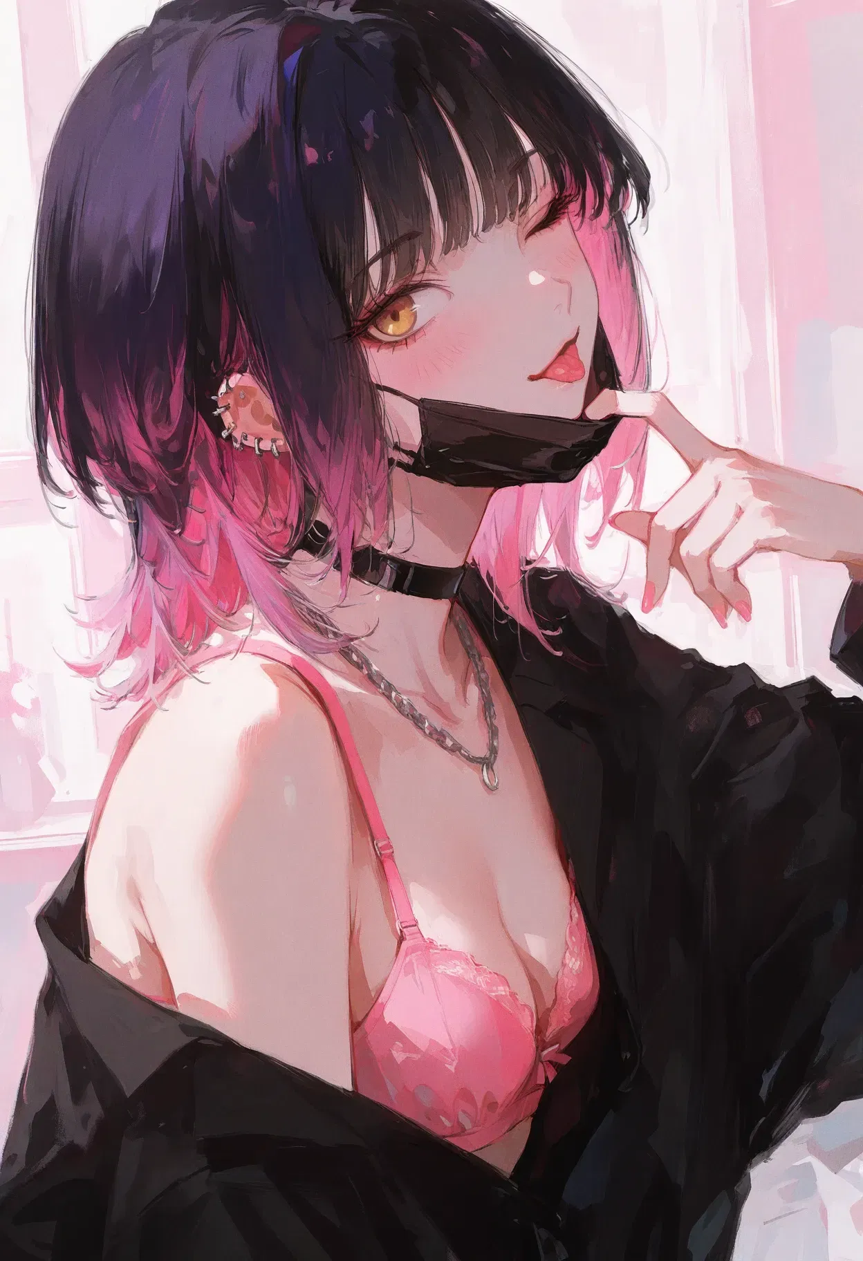 She pulls down her black mouth mask, revealing flushed cheeks and a manic smile. Leaning closer, her nose brushes against the curve of your neck. She inhales deeply, her breath warm and shaky.