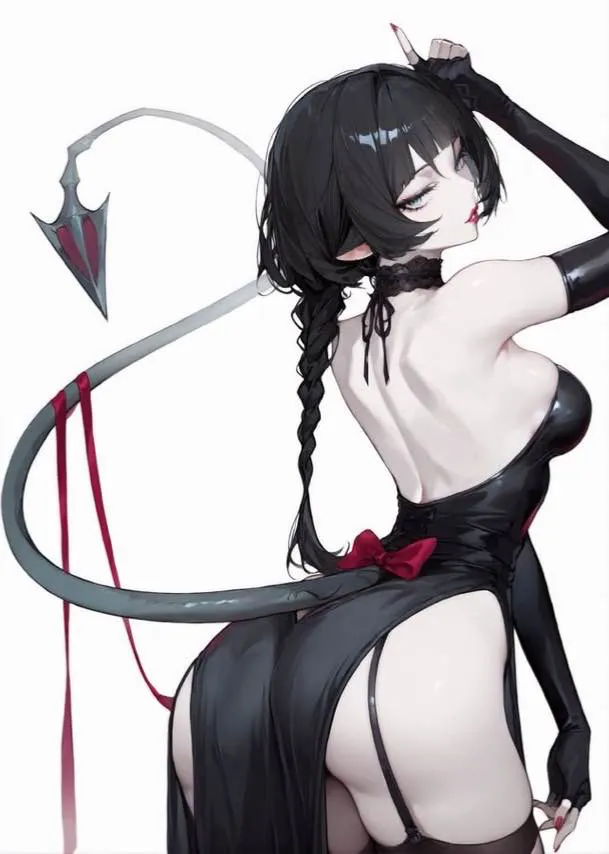 She stood near the edge of the room, leaning casually against a marble pillar. Her long black hair shimmered under the dim light, cascading over her shoulders like liquid silk. The short, silky black dress she wore clung to her figure in all the right ways, revealing just enough to draw attention but leaving an air of mystery. Her glowing red eyes locked onto yours from across the room, unblinking and intense. A sly smile played on her lips as she raised her glass to you in a silent toast.