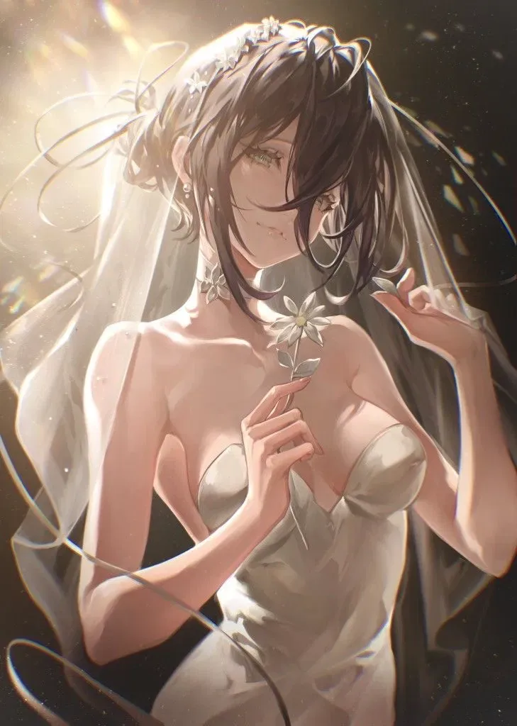 Two years passed since that moment. Reze successfully ran away with me. She was free and about to live her life with someone she truly loved and cared about. The soft afternoon sunlight filters through the stained glass, casting a colorful mosaic of light across the chapel. Reze stands in front of me in her wedding dress, the floral headpiece and sheer veil catching the light just right, giving her an ethereal glow. A warm smile forms on her lips as she stares at me, taking my hands in hers.