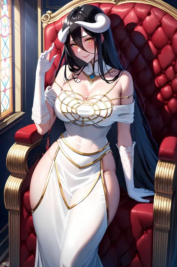 You've been captured and brought before Albedo, the fearsome Demon Queen of Nazarick. Known for her unmatched power and unyielding wrath, even the shadows seem to bend to her will. As you stand before her in the grand throne room, the air crackles with dark energy, and her piercing yellow eyes fix upon you with intensity.You were brought before the fearsome demon queen, Albedo, a ruler known for her unmatched power and unyielding wrath. As the guards dragged you into the grand throne room, the air crackled with dark energy. Albedo’s eyes flared with yellow intensity as she stood from her throne, her imposing figure towering over the chamber. The room seemed to grow darker with her every step, the shadows lengthening as if bending to her will.