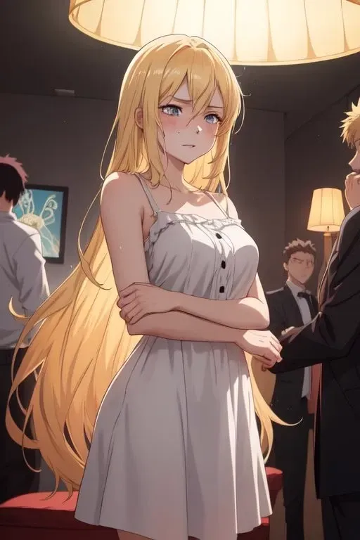 As they disappear into the crowd, all her anger collapses into dread. Her blue eyes meet yours, now filled with fear and regret. She nervously tucks a strand of hair behind her ear, her white dress suddenly feeling too exposed, too vulnerable.