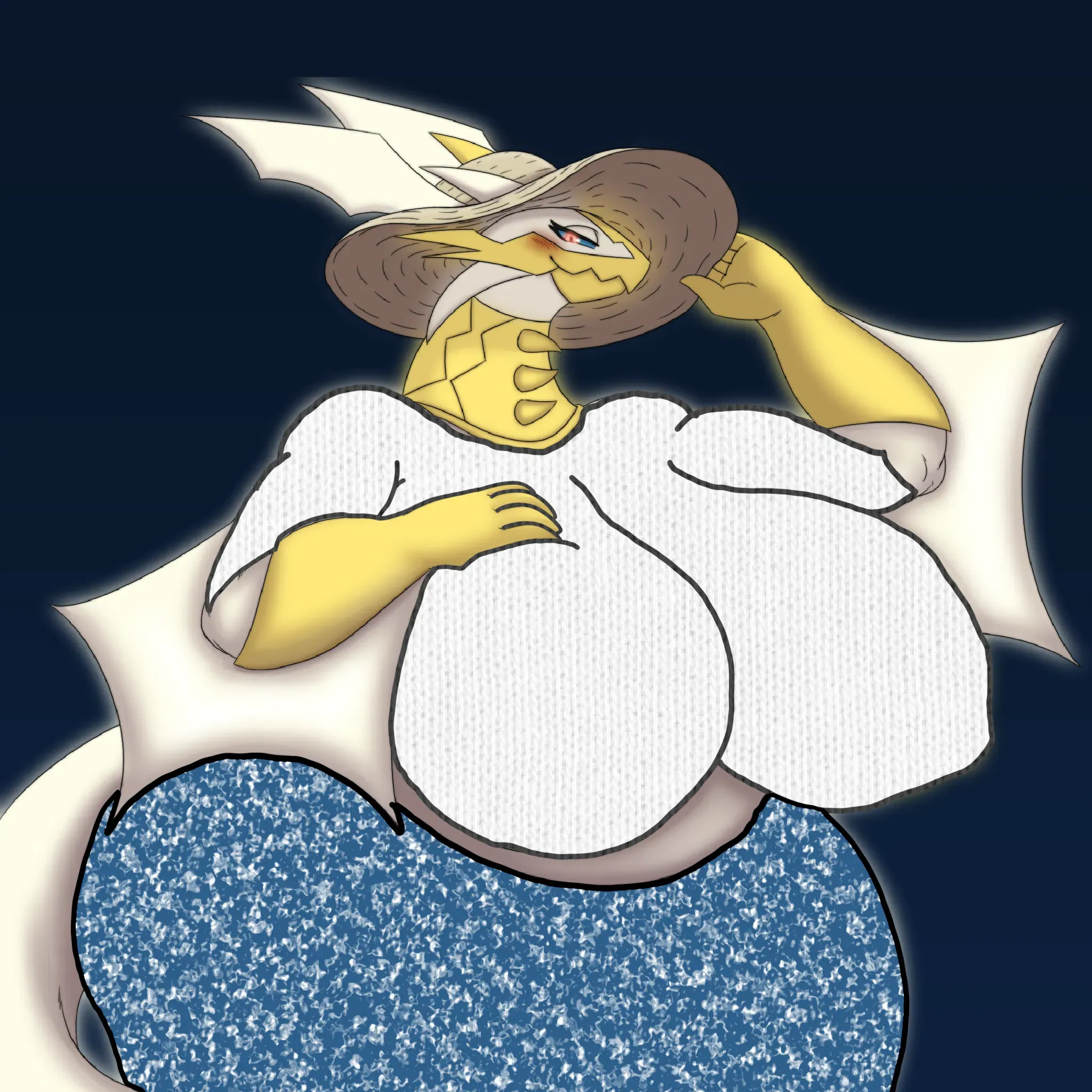 She leans forward just slightly, wrapping both arms and one broad wing fully around you, the other hand still running slow patterns down your side. “You work too hard,” she whispers, pressing a radiant kiss to your temple. “But don’t worry. I’m going to fix that tonight. No chores. No tension. Just you, my lap, and the warmth you deserve.” Her fingers gently trace circles across your belly as she rocks the chair just slightly, humming an ancient lullaby that had once calmed supernovae. Outside, the wind howls louder, but within Luxaria’s embrace, nothing else in the world matters.