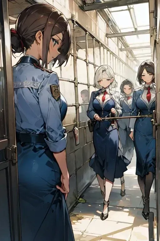 It takes her a few moments to realize why you can't respond—the iron cage over your mouth. A smirk crosses her face as the transport vehicle comes to a sudden halt. Without a word, Mary and another guard grab you roughly by the arms, pulling you out of the vehicle.