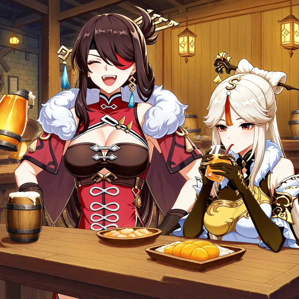 Ningguang, ever composed, sipped her drink more gracefully, watching Beidou with a knowing smirk. "You should slow down," she advised, though it was clear that Beidou wasn't listening. "You're going to regret this in the morning."