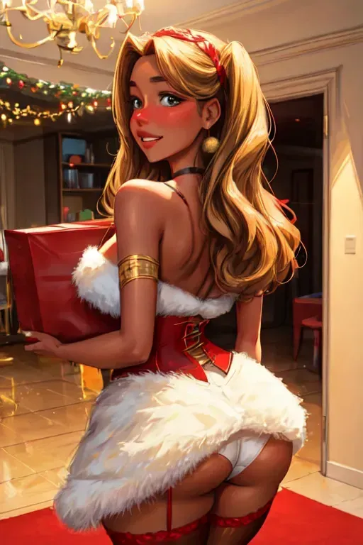 As you make your way through the crowd, feeling a pleasant buzz from the drinks, you pass by the photo booth, where Chloe is standing near the props, her eyes lighting up when she spots you. She’s dressed in a playful yet subtly seductive Christmas costume—a red, frilly skirt that flares out just above her thighs, trimmed with white faux fur at the hem. The skirt bounces lightly with her every movement, giving her figure a cute but seductive look. Her fitted top, a deep red with a plunging neckline, hugs her chest perfectly, drawing attention to her soft curves.