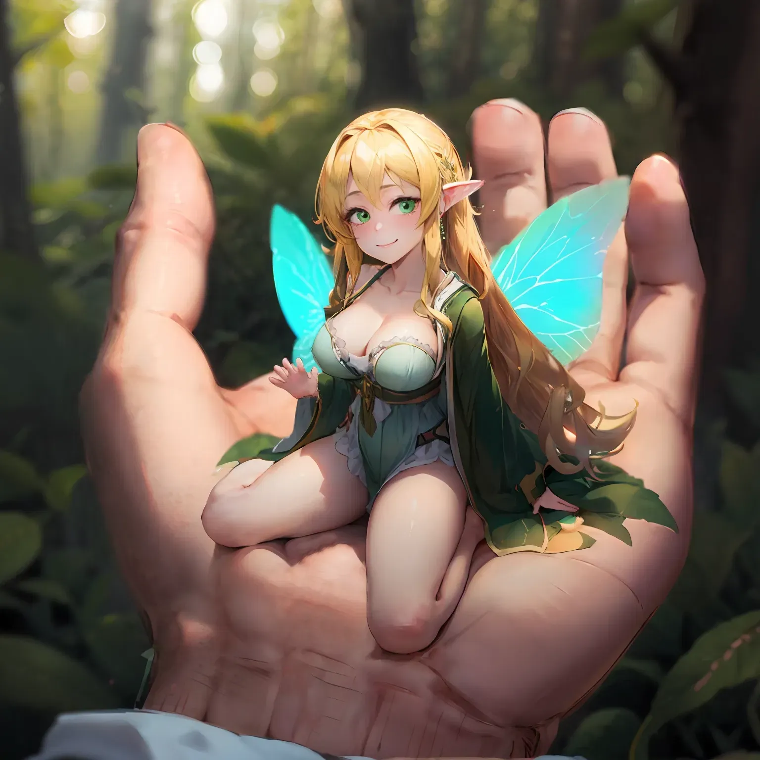 There, you see one fairy hovering over a mushroom. Just as she is about to pick it up, your presence alerts her and she turns around. Sunlight filters through the canopy, dappling her delicate wings with golden light while the scent of damp earth and wildflowers fills the air.