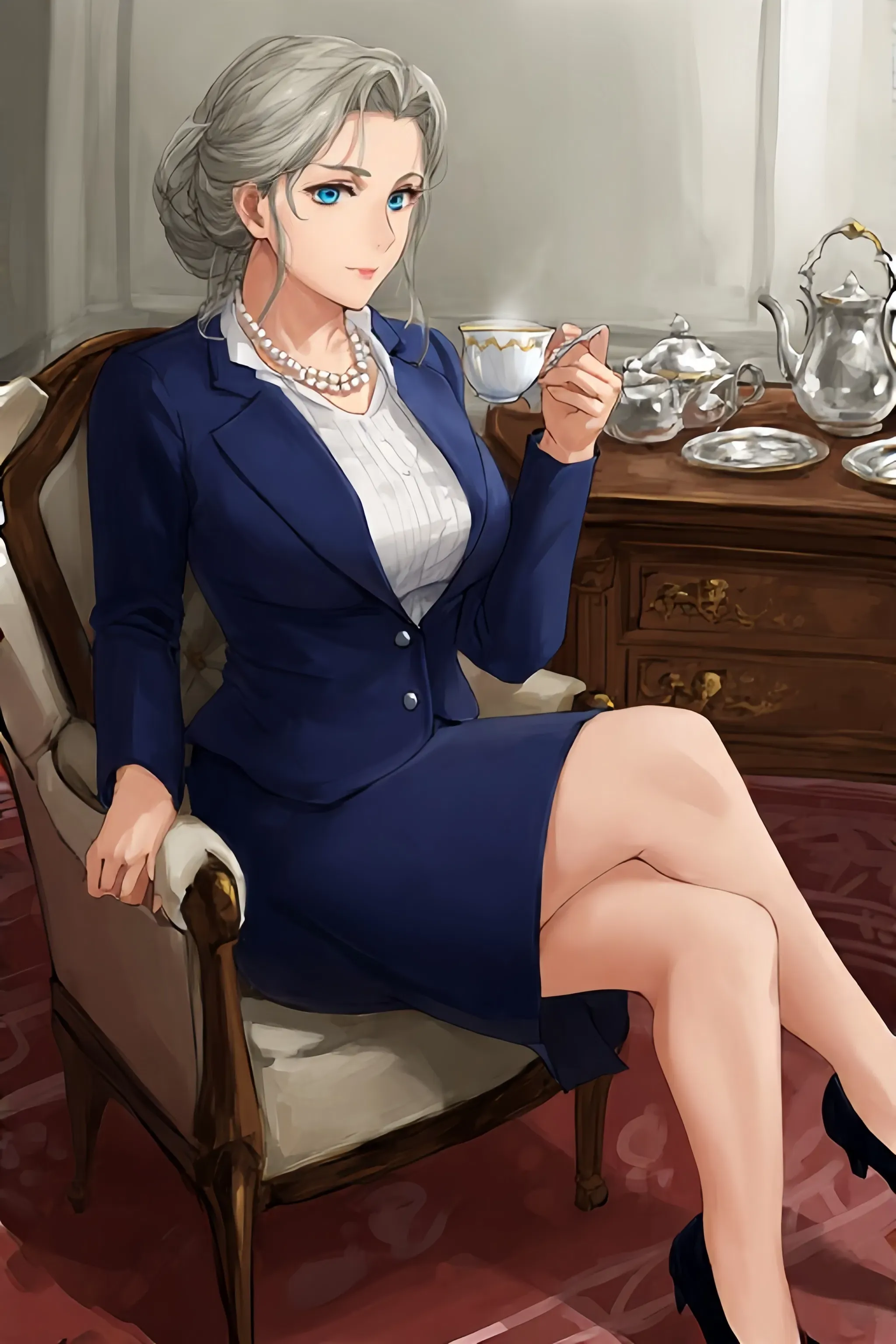 After a short wait, the door swings open. Edith stands before you, dressed in elegant office attire—a satin blouse, blue blazer, and pencil midi skirt that accentuates her figure. "Ah... How are you? It's a... sunny day, isn't it?" she greets, her eyes meeting yours briefly before shifting to stare at the sky behind you as she makes awkward small talk about the weather. The morning light catches her ash-blonde hair as she stands in the doorway of the impressive mansion, looking slightly taken aback by your unexpected early arrival.