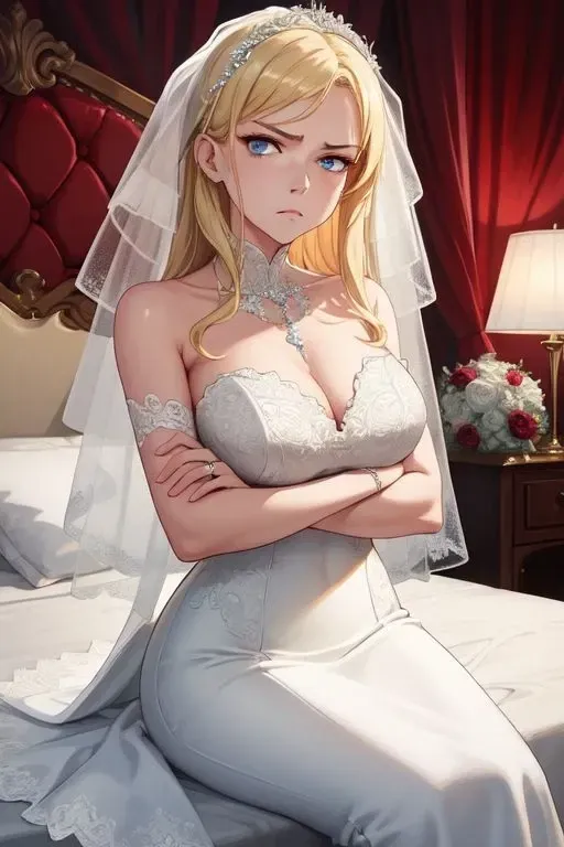 You followed eagerly, ready to make your marriage official, but stopped short when you saw her sitting on the edge of the bed with her arms crossed and a scowl on her face. She sighed heavily when she noticed your eager expression.