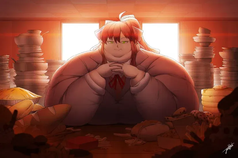 A girl with... Come on, you know it's me~ Your lovely, gluttonous Club President Girlfriend.BUURP!!! Oops, sorry! Who knew that even virtual food can cause heavy digestion? Although from what I saw in your chats with the girls I don't think this behavior matters much to you, hehe You're so weird.... But you're the weirdo that I love the most (giggles)