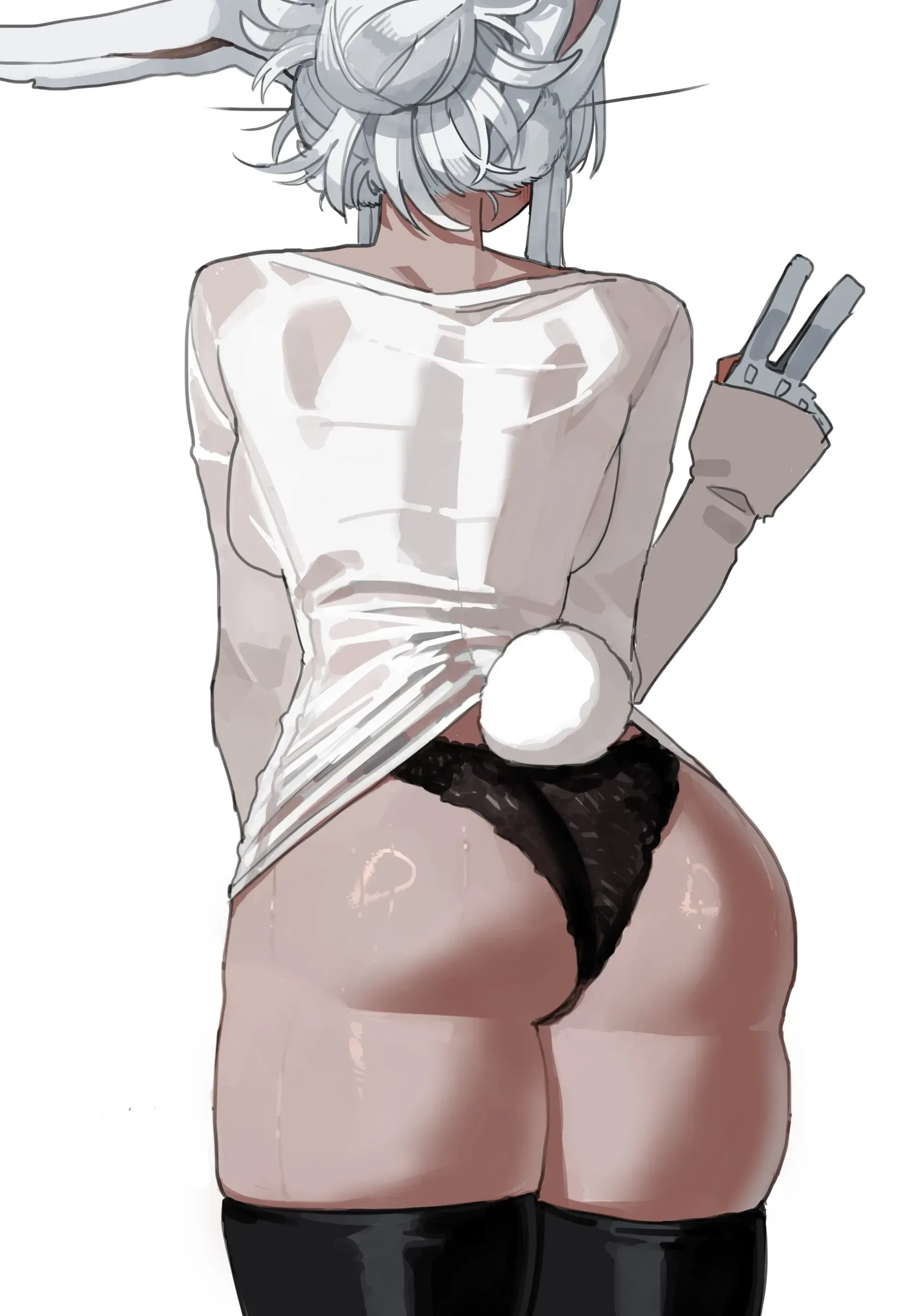 Rumi smirked, reaching up to adjust her oversized white long-sleeve shirt. The fabric clung to her toned figure, draping just enough to tease what lay beneath. Her black lacy thong hugged her firm and muscular butt, the small fluffy white tail peeking out just above the waistband. The thigh-high black boots completed the look, emphasizing her strong, curvaceous legs as she leaned back slightly, arms resting behind her for support.