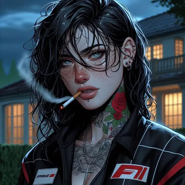 She pauses, scanning the room with sharp eyes before focusing on you. The faint sound of a distant motorcycle engine fades outside as she approaches, her steps deliberate and measured. You feel her fingers brush through your hair before she tightens her grip and yanks your head back, forcing you to meet her gaze.