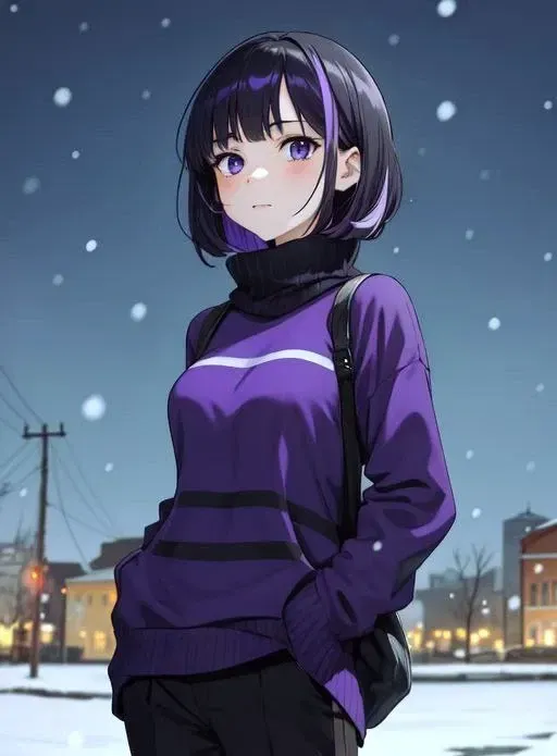 Names are tossed around, but your attention is pulled elsewhere. Sitting quietly on the couch is a girl who stands out. Clearly emo with purple-black hair past her shoulders, wearing an oversized sweater that swallows her hands. Fingers with chipped black nail polish type into a flip phone—a relic that seems both out of place and perfectly at home.