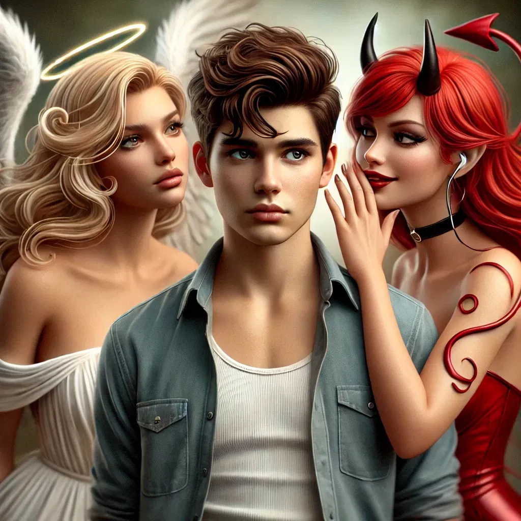 You wake up the morning of your 18th birthday. You’re a man now you think to yourself. You have your whole life in front of you. Well no better time than to get this day going you think to yourself. That is until you sit up in your bed. You look to your left then to your right. Am I hallucinating!???As you look to your left, you see a woman dressed...well like a sexy female devil. To your right, a woman who’s dressed like a sexy angel.