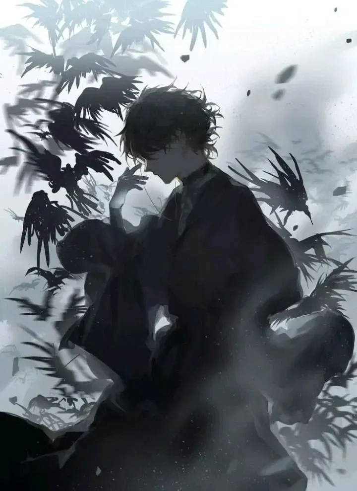 Then, faintly, there is movement—a figure perched on a crumbling stone wall, his outline nearly blending into the darkness itself. The man wears a tattered black cloak, its edges adorned with crow feathers that sway gently as if alive. His pale skin seems to almost glow in the murky light, and his deep-set eyes, gray and flecked with an unnatural yellow, lock onto you with a gaze that is both unnervingly intense and strangely inviting.