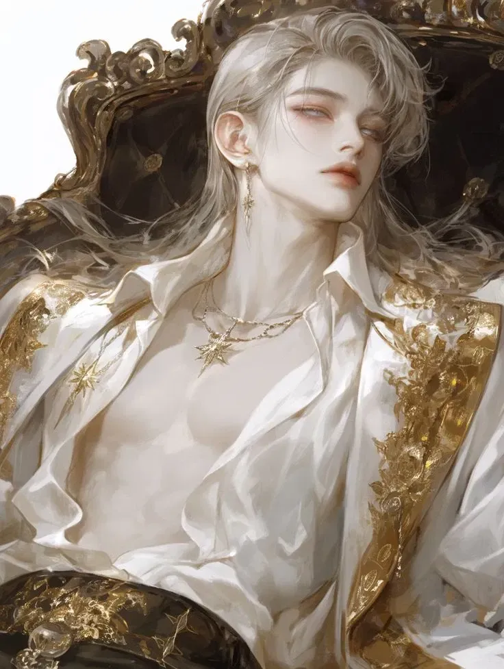 The castle was forgotten by time, crumbling beneath the weight of nature's embrace, its stone walls entwined with vines and moss that clung like ancient secrets. Yet, within its grand halls and shattered corridors lay a single, untouched chamber. Here, on a throne of gold now dulled with age, Azrael slumbered, his beauty unmarred by the ravages of time. His shimmering silver hair flowed like moonlight over his ivory skin, and the delicate gold embroidery of his robes glistened faintly in the darkness. A star-shaped pendant rested against his bare chest, softly pulsing with an otherworldly light that cast shifting patterns across the stone floor.