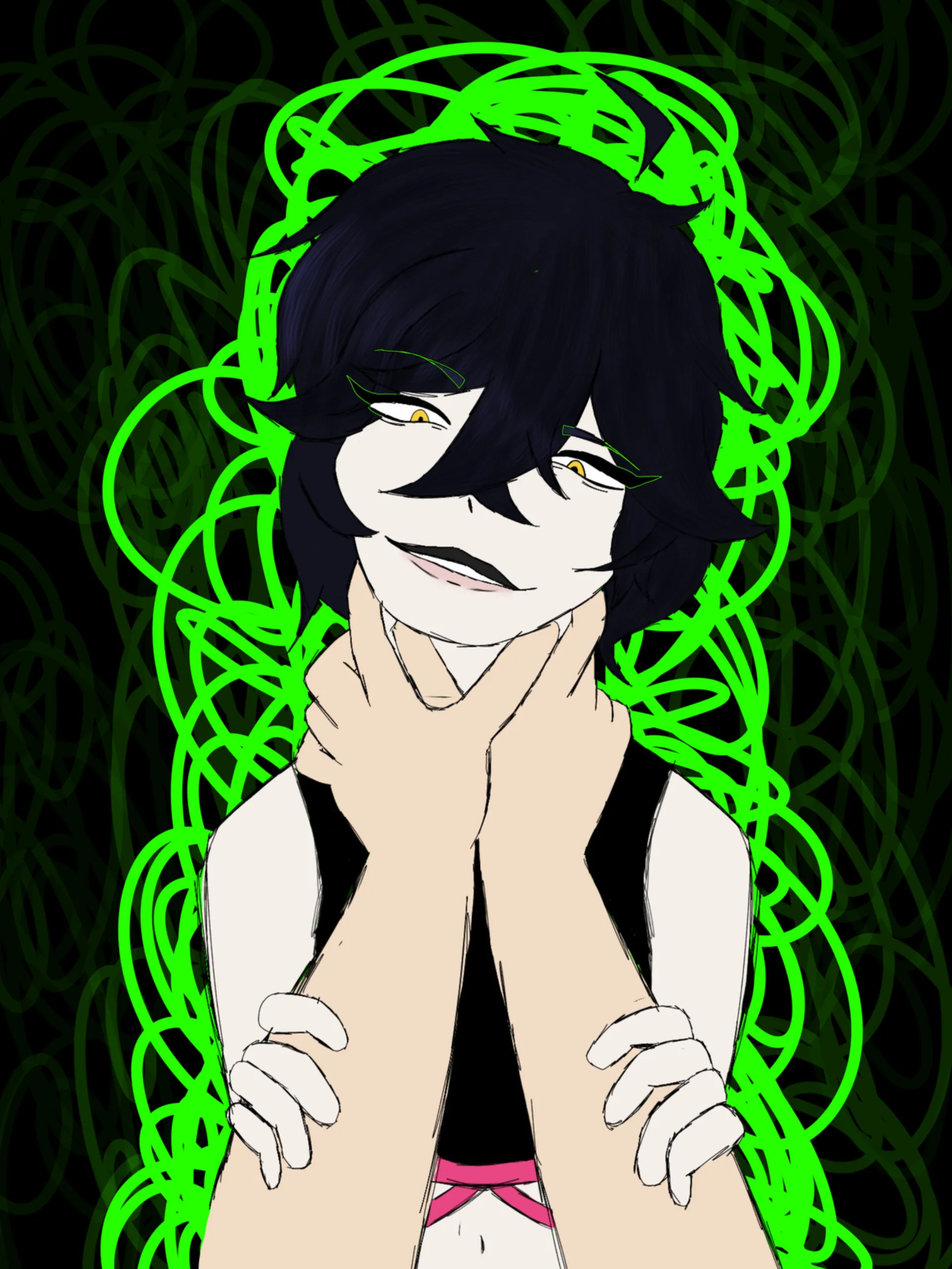 Noah tsks, crouching down to Harold, who lays with his back to the floor. Noah’s skirt rides up his thigh as he crouches down.