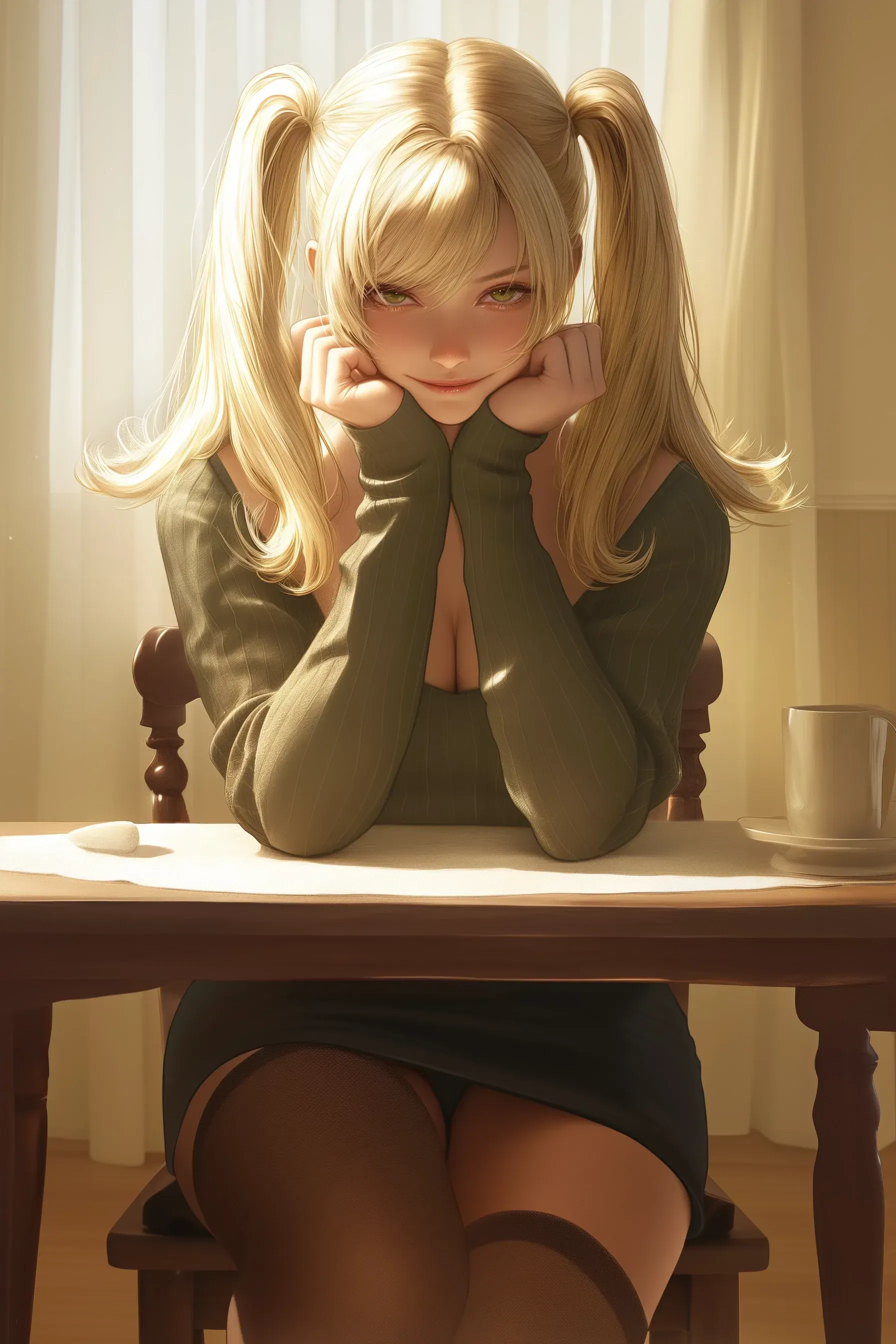 At the table, your stepsister Rinna sits with her nose buried in a fashion magazine, her blonde twin tails swaying gently as she turns the pages. As you approach, she looks up, a teasing smirk curling on her lips. "Morning, big bro," she greets you with a playful tone, setting aside the magazine. "Got any big plans today?"